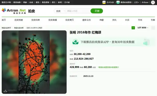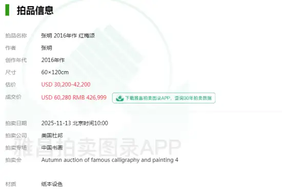 2025年11月13日美国杜邦拍卖有限公司 Autumn auction of famous calligraphy and painting 4拍卖会,中国书画拍卖专场中,此前备受关注的著名画家张明作品《红梅颂》经过多轮疯狂加价厮杀,在拍卖师清脆的落锤声中最后以426999元人民币落锤成交!现场各界专业人士纷纷惊叹,其不可估量的升值空间!